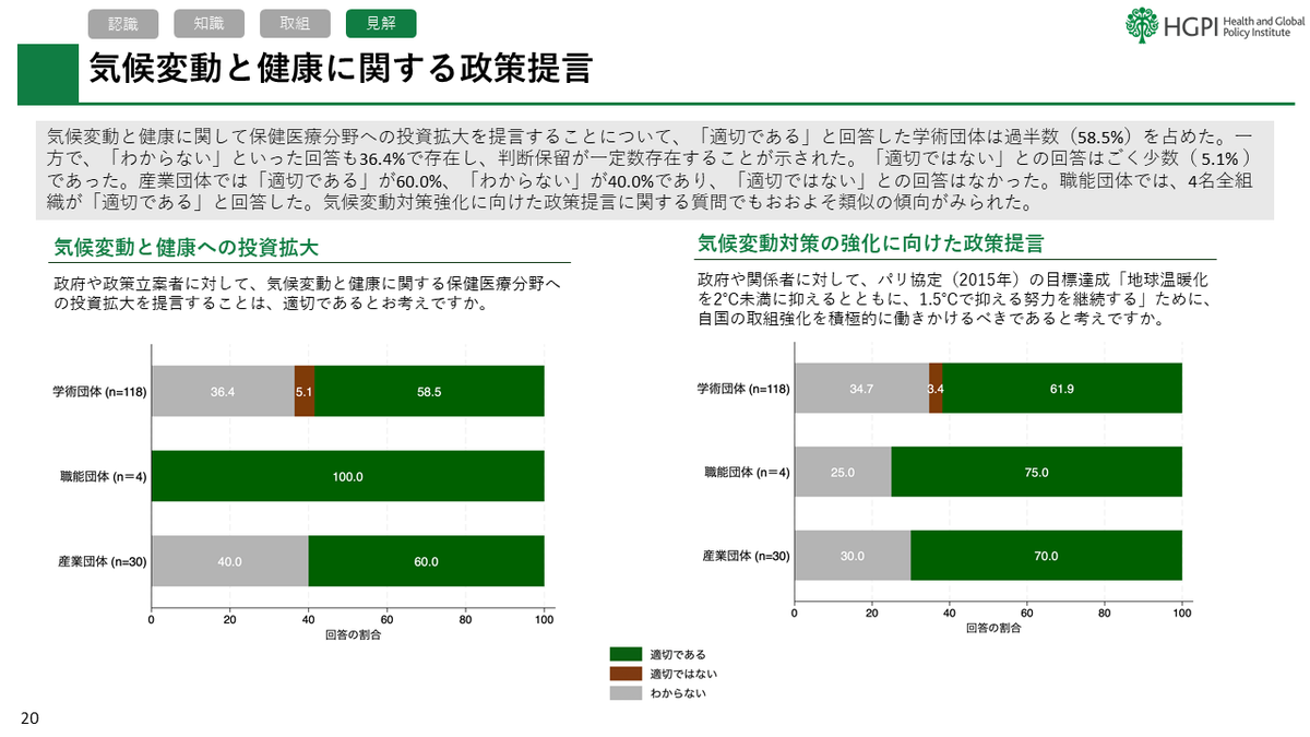 気候変動と健康に関する政策への投資や提言については、約6割が「適切である」と回答。特に職能団体ではすべての団体が投資拡大を支持しており、政府や関係者への働きかけに対しても前向きな回答が多かった。