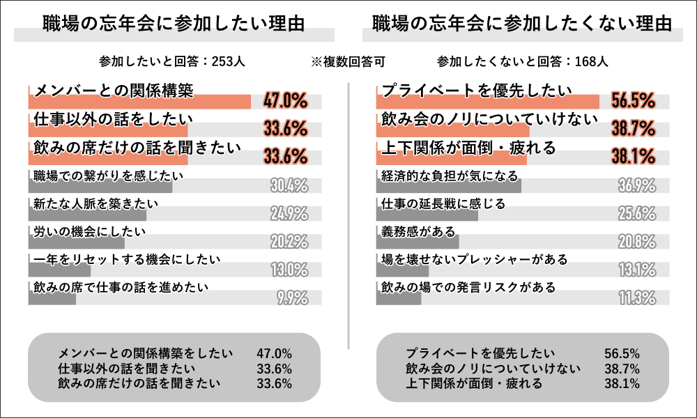 参加したい理由のトップは「メンバーとの関係構築」で、次いで「仕事以外の話をしたい」と「飲みの席だけの話を聞きたい」が同率となった。
