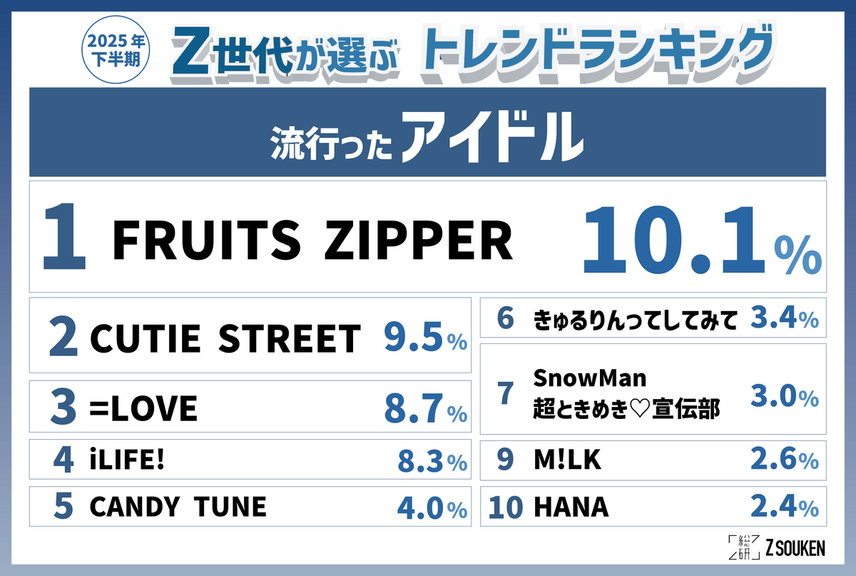 また「流行ったアイドル」ランキングでは、KAWAII LAB.が手掛けるFRUITS ZIPPERとCUTIE STREET、そして指原莉乃プロデュースの=LOVEがトップ3を占め、日本の女性アイドルグループがZ世代のアイドル市場をリードしていることがわかる。