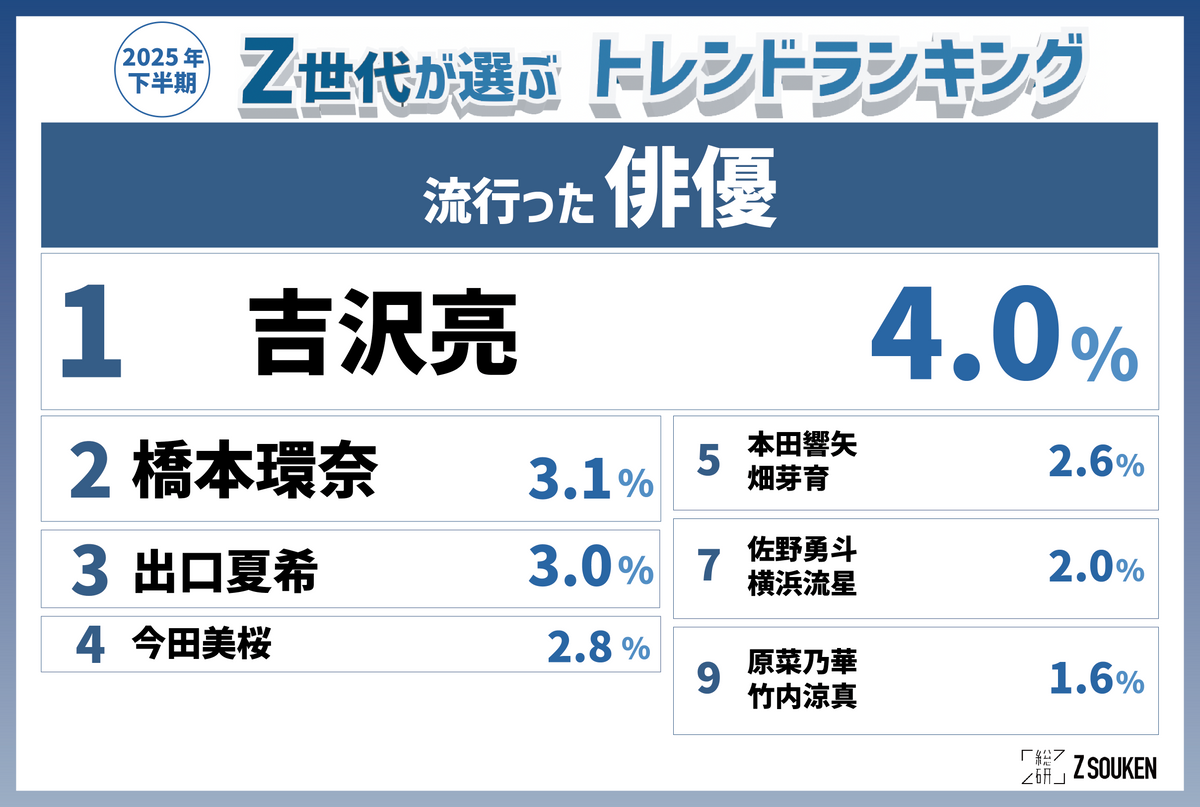 「流行った俳優」ランキングでは、映画「国宝」などでの演技力が評価された吉沢亮、親しみやすいキャラクターで支持を集める橋本環奈、そして派手すぎず落ち着いた雰囲気で密かにファンを増やしている出口夏希の3名が上位に入った。SNSでの話題性だけでなく、確かな実力と作品での評価が支持を集める鍵となっている。