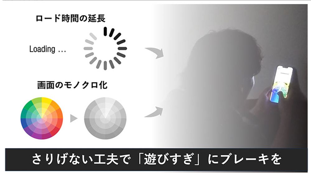 待ち時間を長くすると、自然に区切りがつき、遊び続ける衝動が和らげられるという。また画面をグレースケールにすると、視覚刺激が抑えられて没入感が低下し、ちょっと気持ちが落ち着くというわけだ。