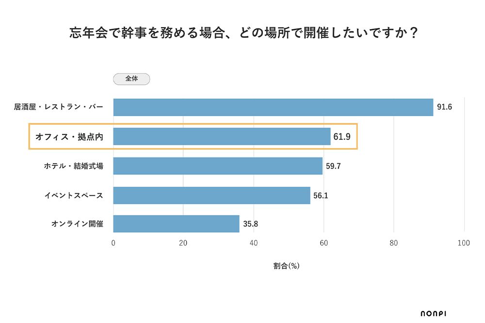 どこで開催したいかとの問いには、9割以上の人が居酒屋、レストラン、バーなどの飲食店だと答えた。それが定番だし、料理や飲み物はお店に任せられるので楽と言えば楽だ。そのほか、ホテルや結婚式場などのイベント会場もあげられた。