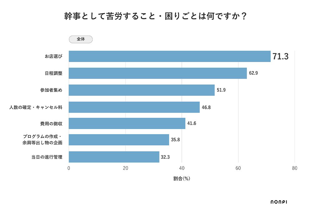 フードコミュニケーションカンパニー、ノンピは、企業や役所に勤める20〜59歳の男女310人を対象に、忘年会に関する調査を実施した。自分が忘年会の幹事を務めるとしたら、という想定で質問に答えてもらっている。まずは、幹事としていちばん苦労することは何かを尋ねると、1位はお店選びだった。2位は日程調整、3位は参加者集め。