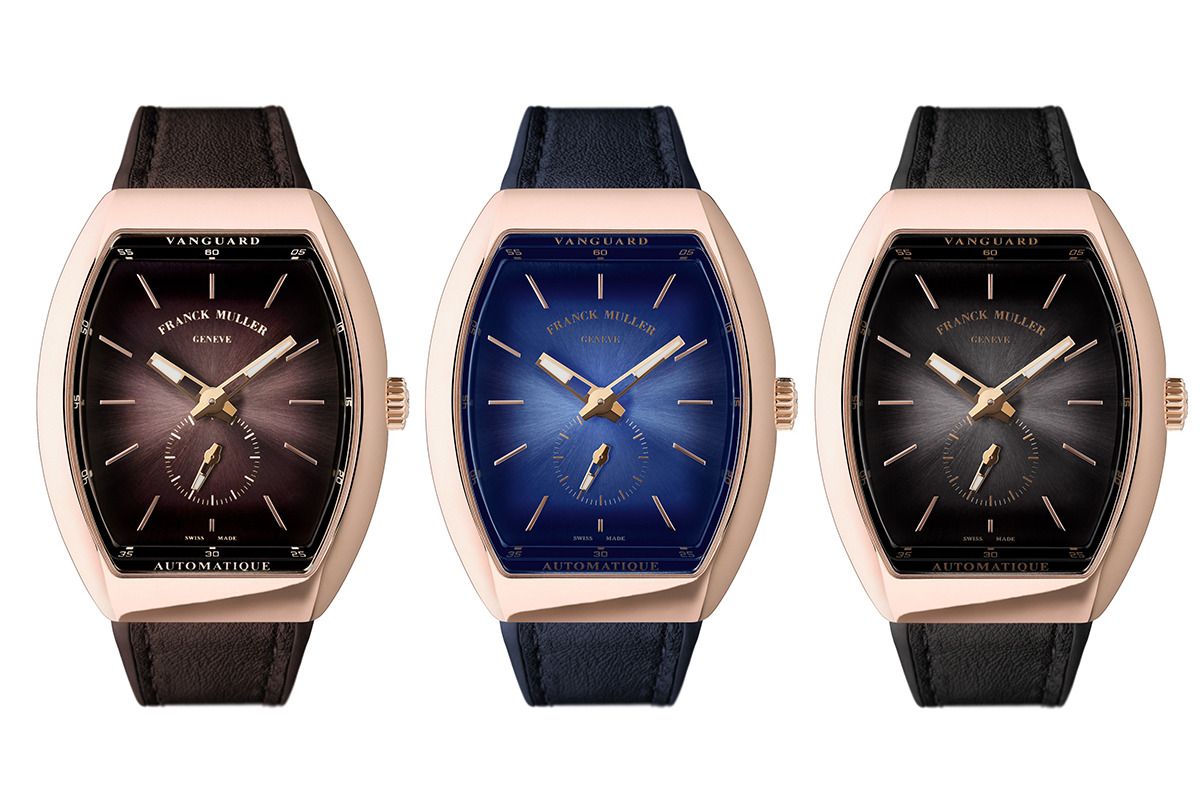 左:柔らかな陰影によって移り行く時を表現するブラックダイヤルの「ヴァンガード スリム スフマート」。自動巻き、18KPGケース、ケース縦52.3×横42.5㎜。¥3,850,000 搭載されるムーブメントはCal. FM708。パワーリザーブ約35時間。