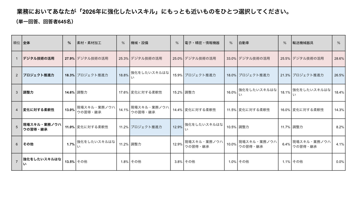 しかし、これらの課題解決の手段としては、すべての業種で「デジタル技術の活用」が強化したいスキルのトップとなり、「人手不足」(39.4%)や「業務の属人化」(34.7%)といった課題の改善手段として、デジタル活用に高い期待が寄せられている。