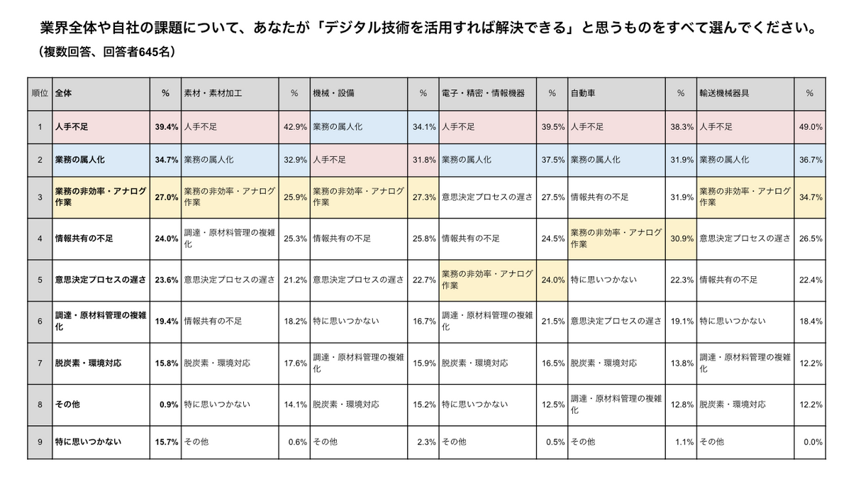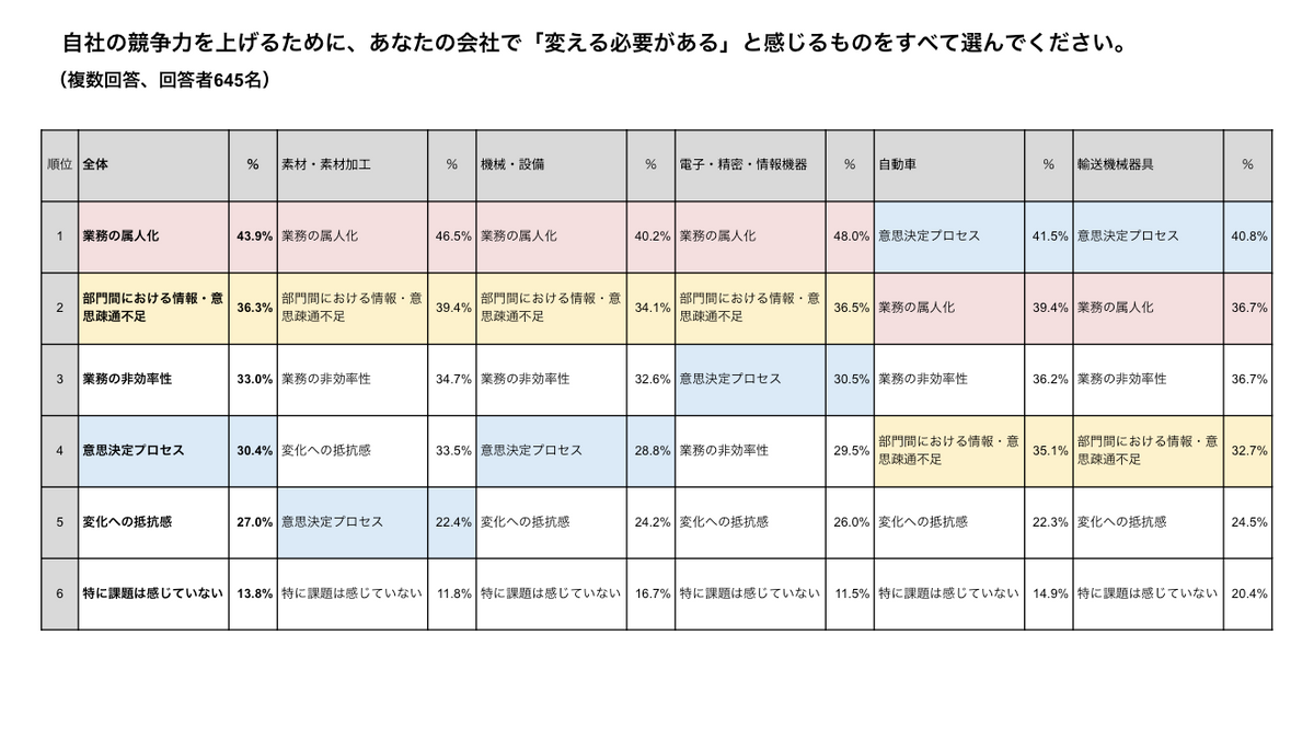 このような複合的な課題に対し、製造業の管理職が競争力強化のために変えるべきこととして、全体の43.9%が「業務の属人化」をトップに挙げている。また、自動車・輸送機械器具では「意思決定プロセス」が最大の課題となっており、産業構造によって変革すべきポイントが異なっている。