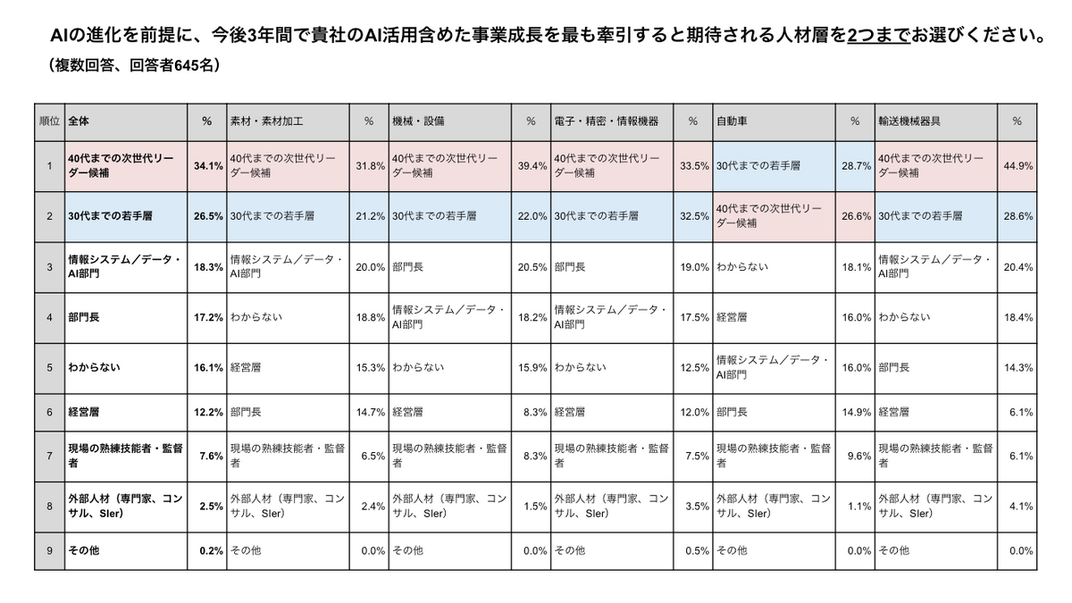 さらに、事業成長を牽引する人材層としては「40代までの次世代リーダー候補」(34.1%)と「30代までの若手層」(26.5%)に期待が集中しており、若手・次世代層がAI活用を含めた新しい取り組みを牽引する存在として見られている。
