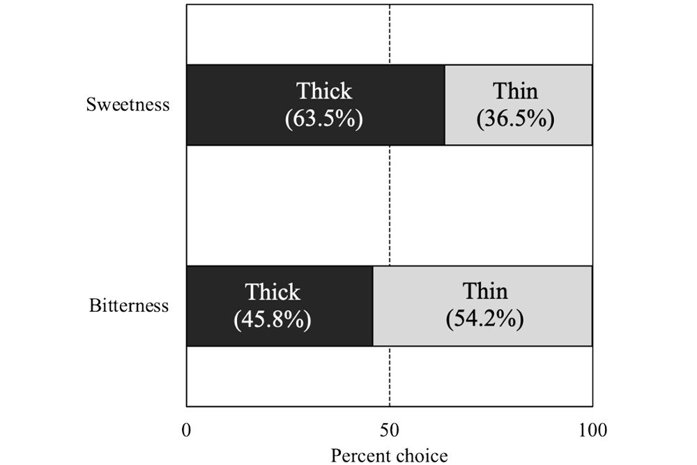 結果は、厚いグラスで甘いと感じた人の数が多く、薄いグラスでは苦いと感じる人が多かった。実験は2度行われ、2回目はグラスの厚みはそのままで、重さが同じになるように調整した。それでも評価はほぼ同じだった。これにより「現象の一定の普遍性が確認されました」という。