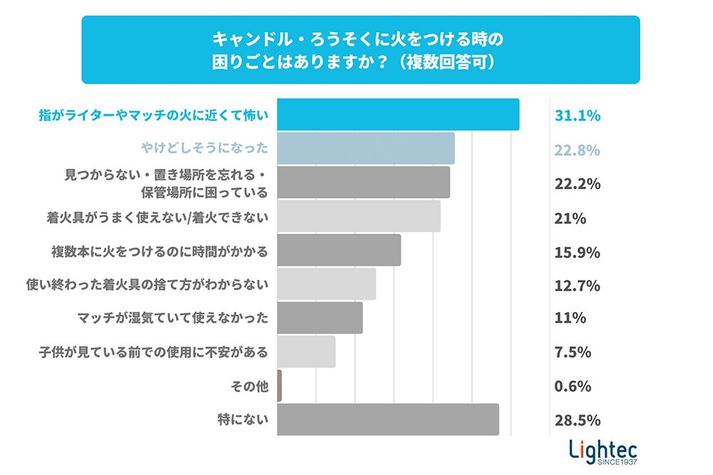 ロウソクへの点火時に困ることを尋ねたところ、「指がライターやマッチの火に近くて怖い」、「やけどしそうになった」という回答が多く寄せられた。これは、「短い炎の使いきりライターをキャンドル点火に使用する際に生じやすいリスク」だとライテックは指摘する。