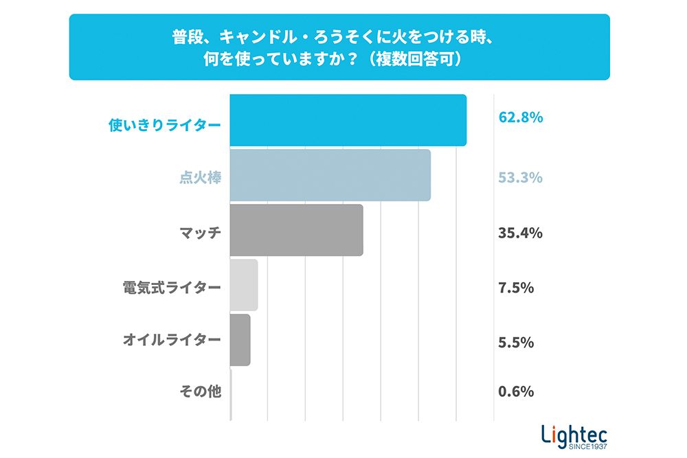 喫煙具メーカーの老舗ライテックは、20〜69歳を対象に使いきりライターに関する調査を実施した(回答数415)。それによると、クリスマスキャンドル、バースデーケーキや仏壇のロウソクなどに火を点けた経験のある人は多く、それらに使いきりライターを用いた人が6割を超えることがわかった。