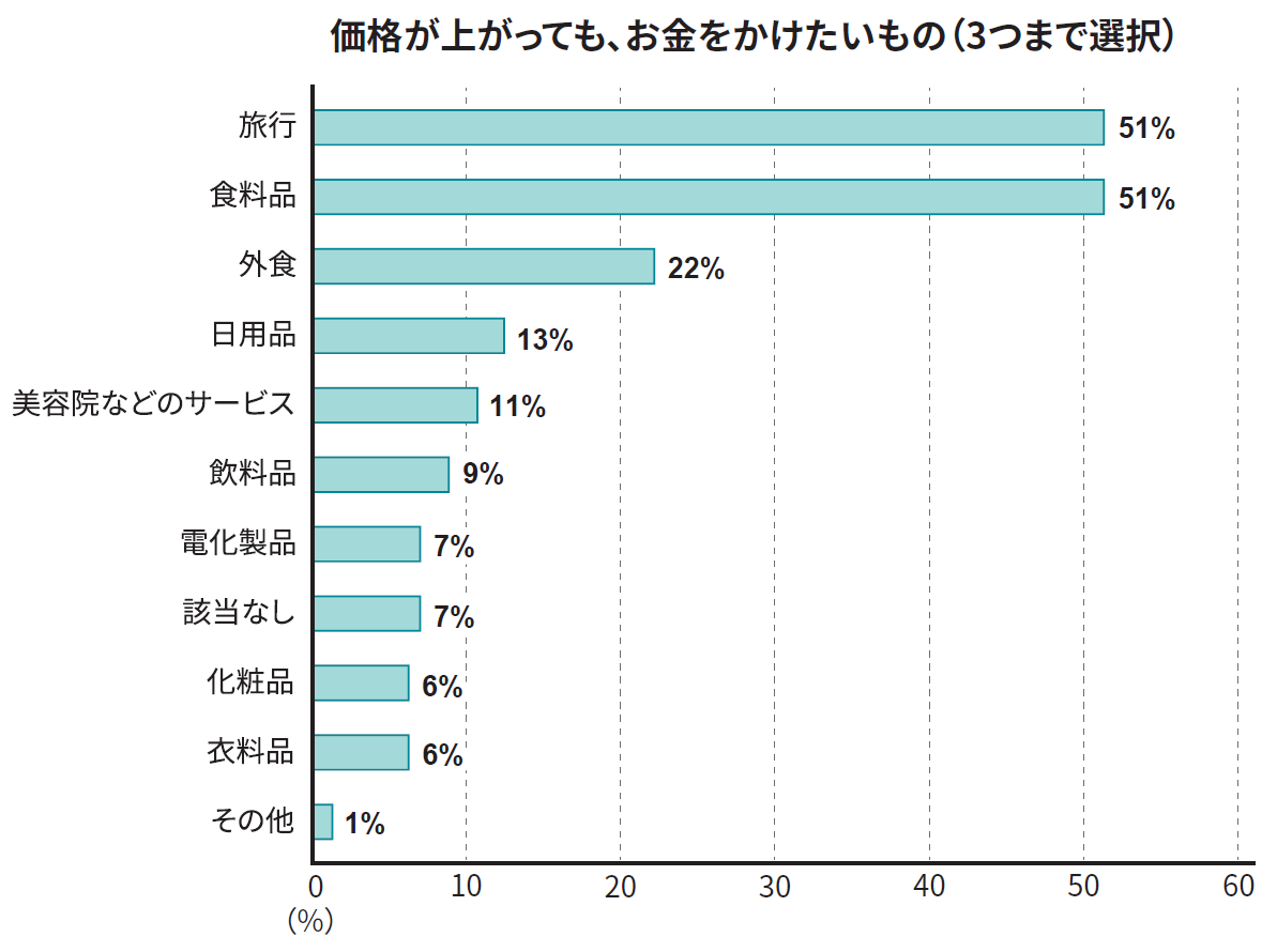 全体として節約を意識しながらも、価格が上がってもお金をかけたいものについては、「旅行」と「食料品」がともに51%で突出した。