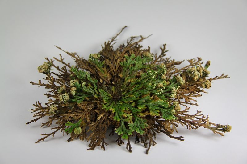 おそらくこのグループで最も極端な種は、一般に「ジェリコのバラ」または「観葉植物界の恐竜」として知られる「セラギネラ・レピドフィラ(Selaginella lepidophylla 和名:テマリカタヒバ)」だ。メキシコ北部と米国南西部に広がるチワワ砂漠が原産で、ほぼ完全な乾燥状態(内部水分が約5%まで低下)に耐え、休眠状態を維持できる。