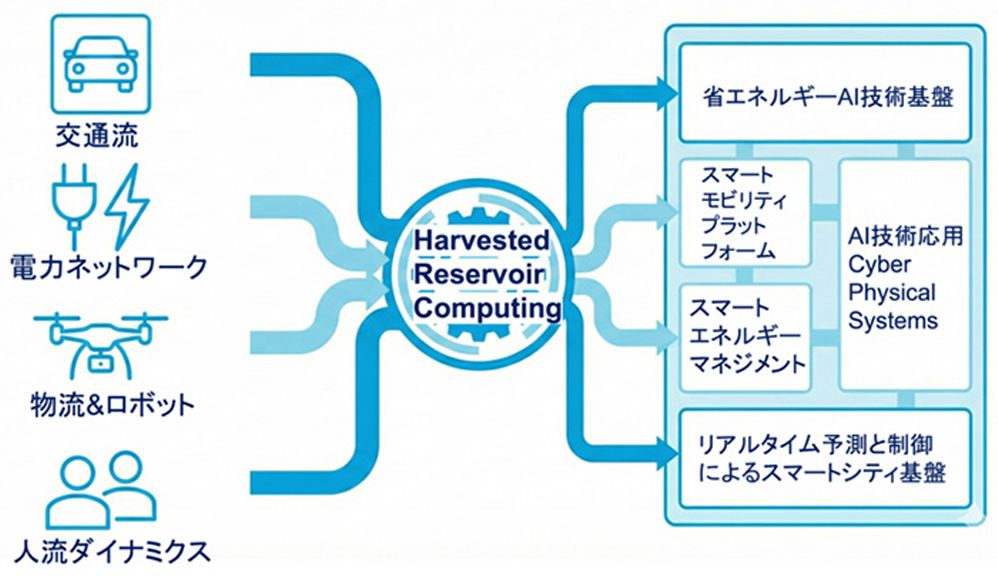 道路のほか、エネルギーネットワーク、物流ネットワークなど、時系列で動きのあるインフラをリザーバに利用すれば、「現実世界そのものが計算を担う省エネルギー型AIシステム」が実現する可能性がある。研究グループはこれを、現実から入力を収穫する「収穫リザーバコンピューティング」とも呼んでいる。