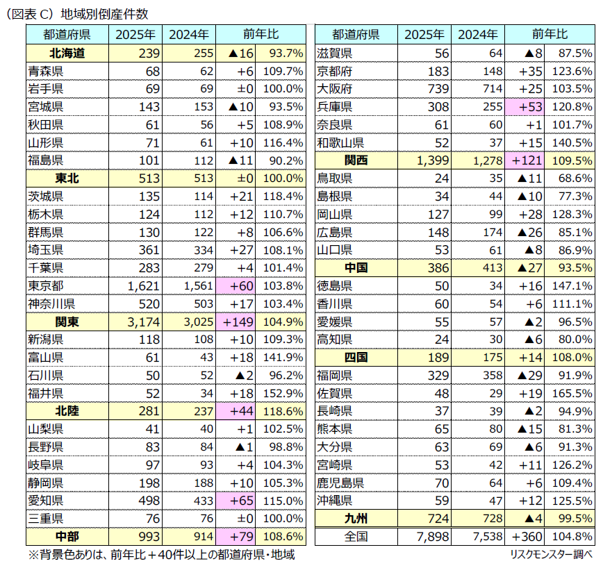 地域別の分析では、国内9地域のうち5地域で前年を上回る結果となった。件数で見れば「関東」が前年比149件増、「関西」が121件増と都市圏での増加が目立つが、増加率では「北陸」が前年比118.6%と際立っている。地域経済の脆弱性が、全国的な経済変動の影響をより強く受けている状況だ。