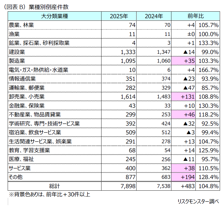 一方で、「製造業」や「建設業」は依然として高止まりしている。資材価格の変動や人手不足による工期遅延が直撃し、資金繰りを悪化させる構造的課題を抱えている。