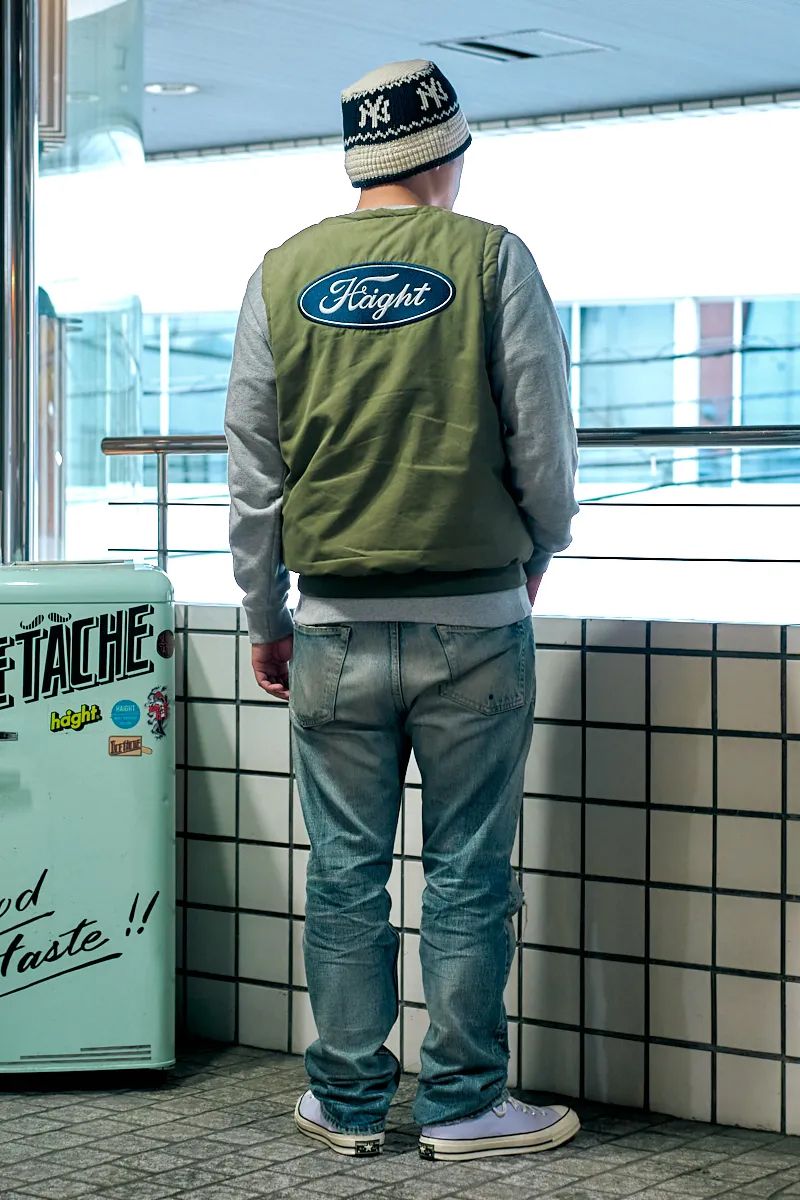 オリーブカラーのワークベストをグレースウェットに合わせる安定感にゾッコンの早坂さん。ただし背中に大きくロゴが入っていたり、ヤンキースのニットキャップだったり、ペールパープルのコンバースだったりと、所々にアイコニックな抜け感を作って冒険も忘れていない。