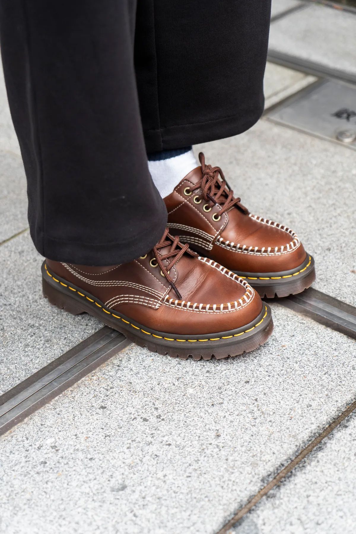 スラックスとレザーシューズというシックな下半身にまとめているからこそ、トップスがミリタリージャケットでも大人らしくまとまる。それに気づいている20代を発見した。