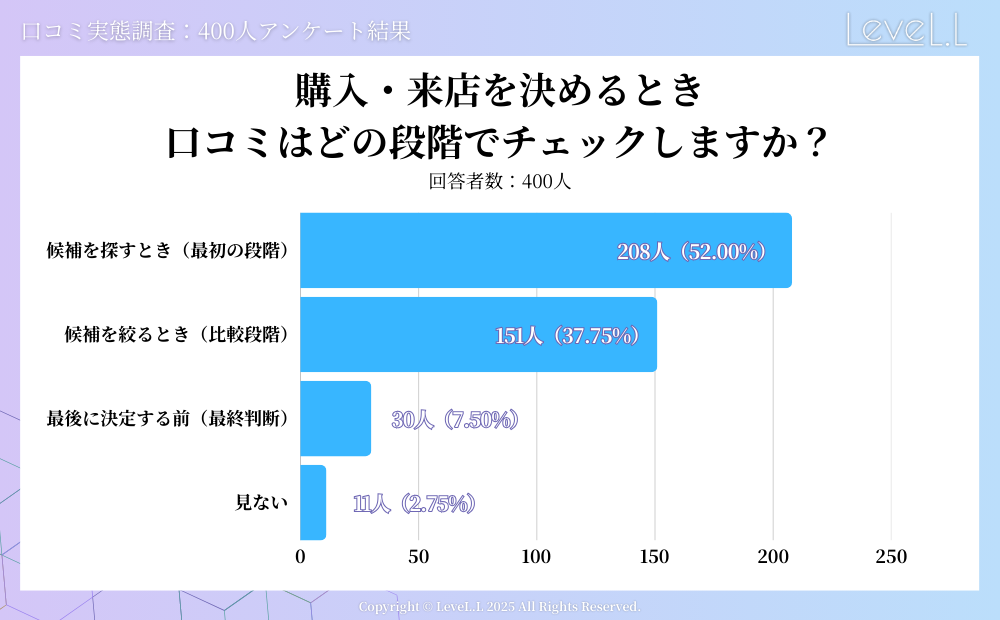 注目すべきは、口コミをチェックするタイミングだ。過半数を超える52%の人が「候補を探す段階」、つまり検討の初期段階で口コミを確認している。比較段階を含めると約9割が最終決定前に目を通しており、悪い口コミが存在するだけで、その企業や店舗は比較検討の土台にすら乗れない「門前払い」の状態になるリスクを孕んでいる。