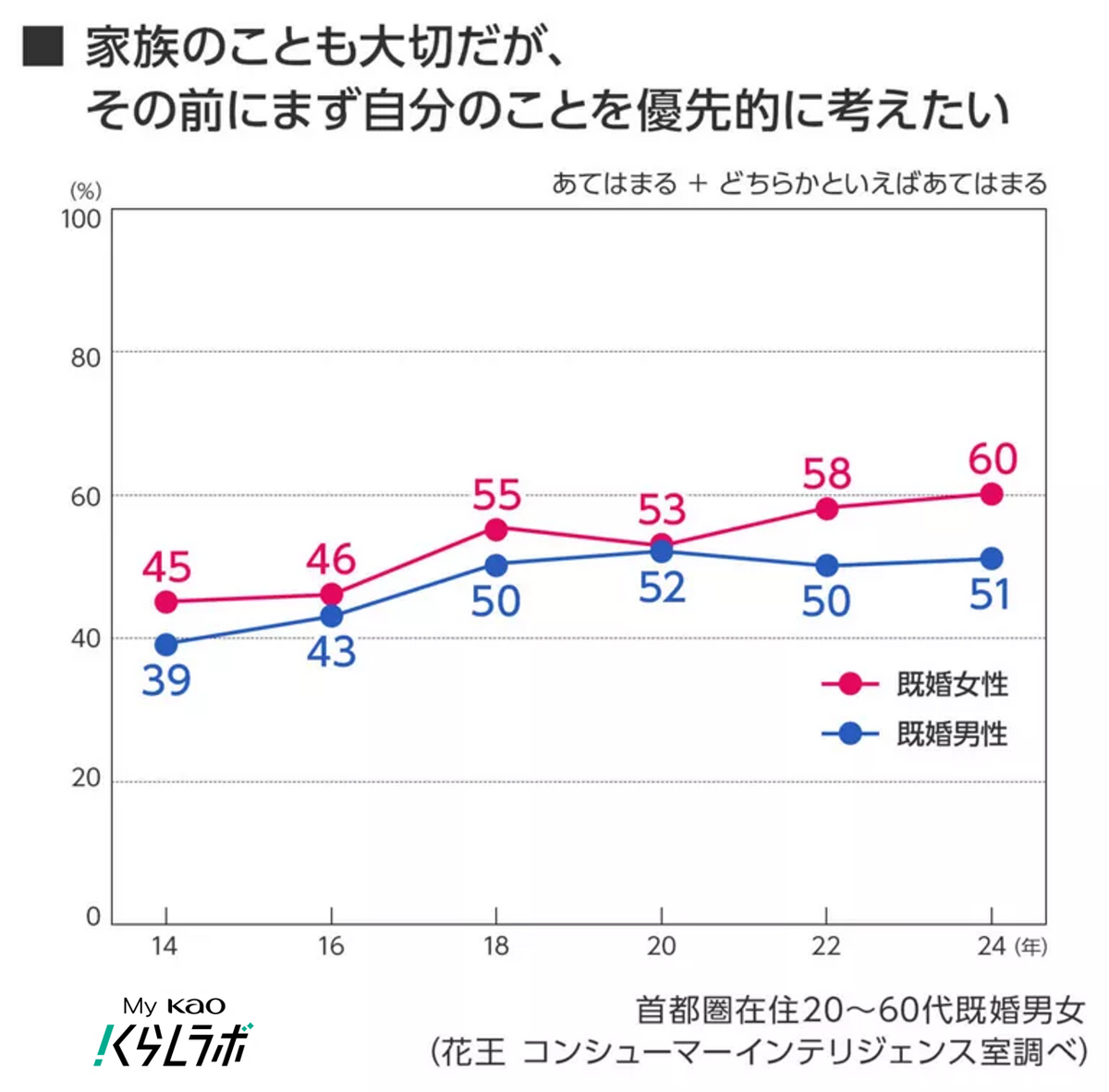 女性の変化はさらに顕著だ。「家族も大切だが自分のことを優先させたい」と考える女性は、45%から60%へと15ポイント増えた。