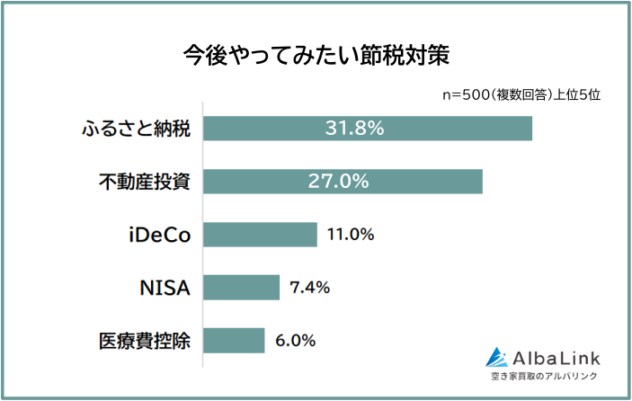 今後やってみたい節税対策の1位も「ふるさと納税」。2位には「不動産投資」が入り、「iDeCo」「NISA」などがあとに続いた。