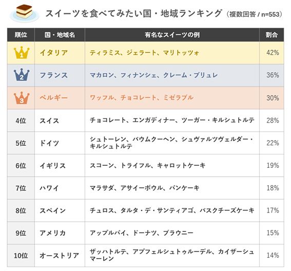 6位以降を見ると、イギリス(アフタヌーンティー文化)、ハワイ(マラサダ、パンケーキ)、スペイン(バスクチーズケーキ、チュロス)、アメリカ(ドーナツ、ブラウニー)、オーストリア(ザッハトルテ)と続く。