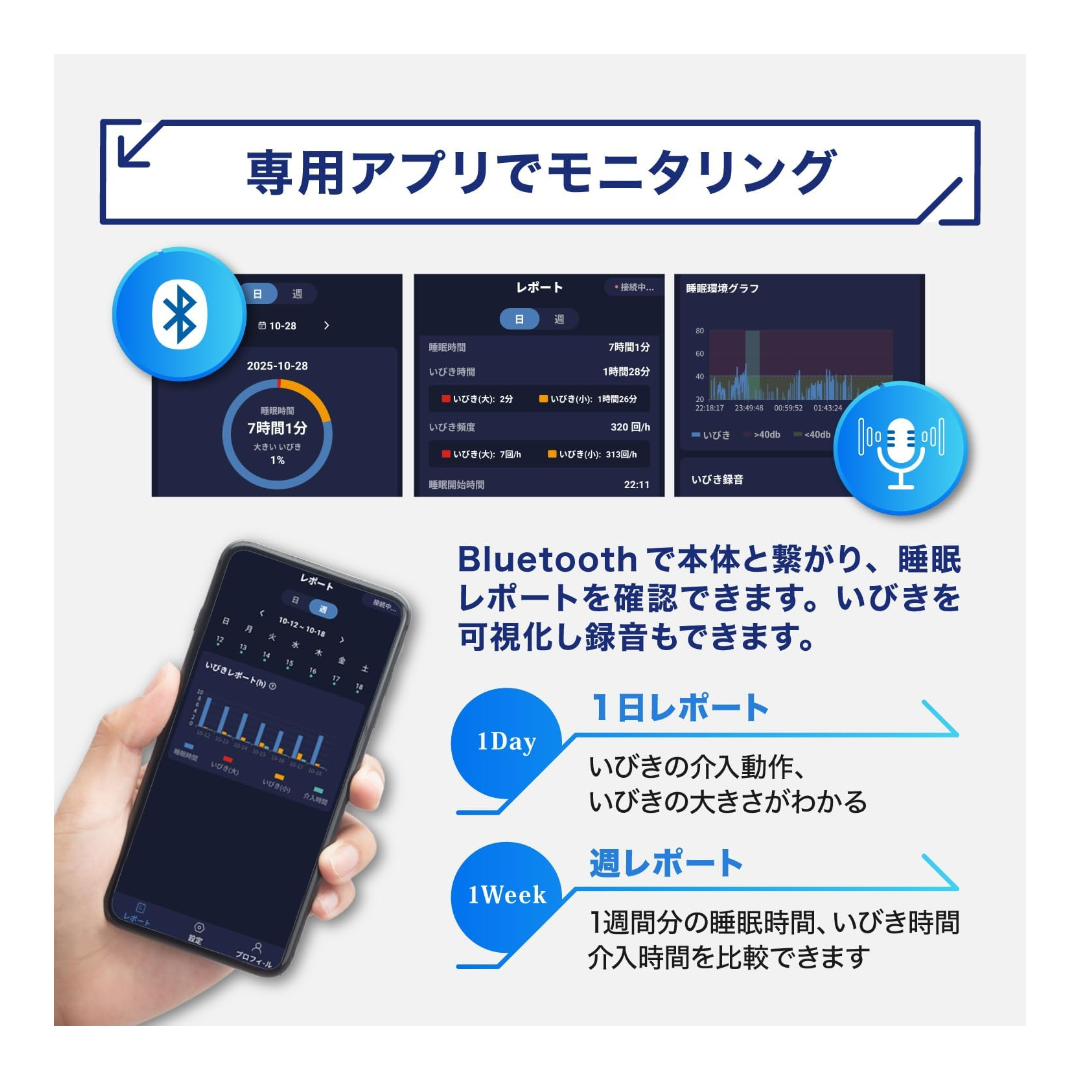 本体とスマホをBluetooth接続するための専用アプリも用意。エアバッグを利用して枕の高さを3段階に設定し、体型や好みに合わせた最適なポジションに調整できる。また、いびきの状態をモニタリングして、録音も可能。自分のいびきを可視化するレポートも作成されるため、睡眠改善の取り組みに役立てられる。