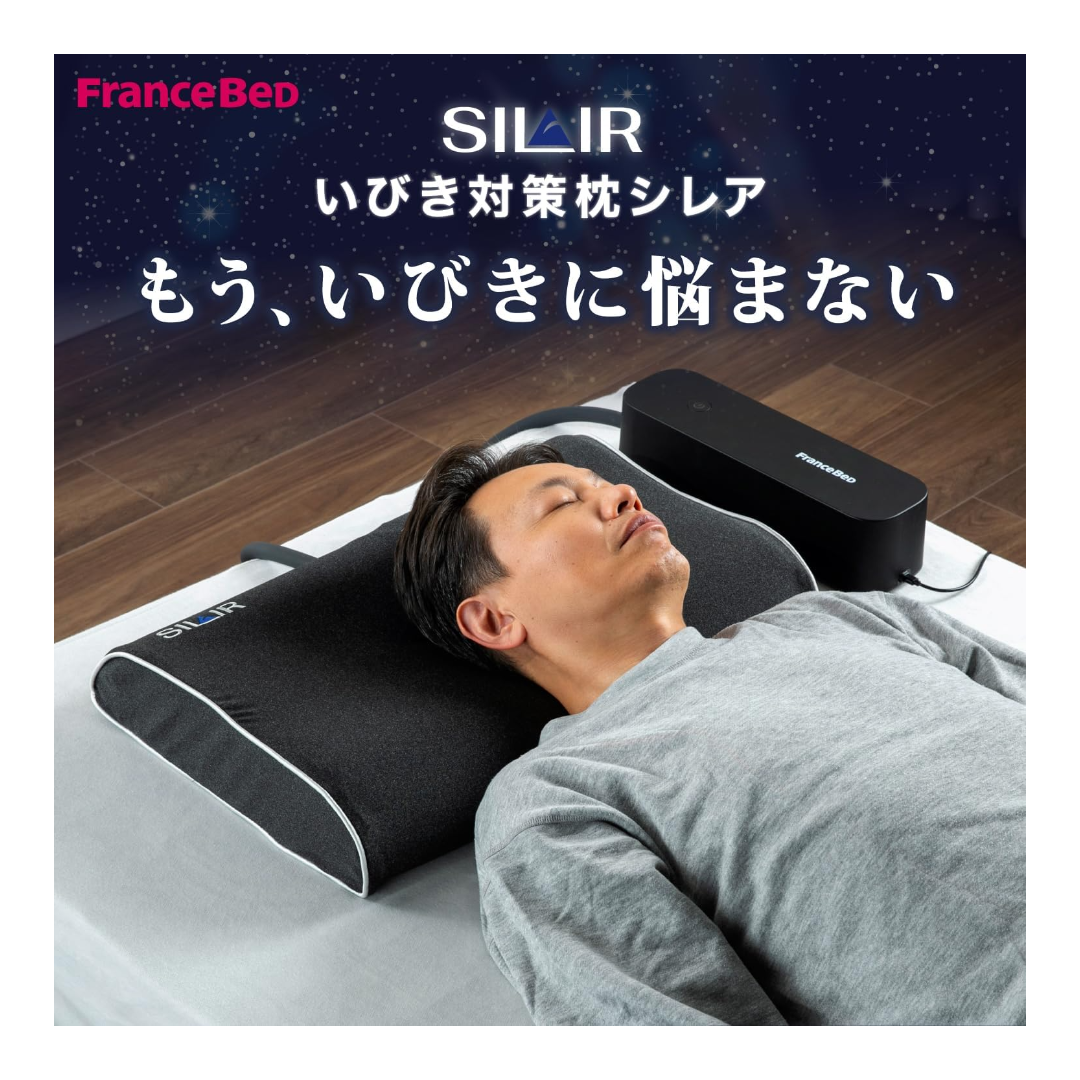 フランスベッドから登場した「シレア」は、センサーとエアバッグを内蔵するいびき対策まくら。センサーがいびきを検知すると、エアバッグが膨張。頭の向きを変えることで、いびきを軽減する仕組みだ。動作音は30dB以下と静かなため、眠りを妨げられる心配はない。