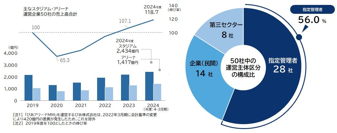 帝国データバンクの調査によると、国内のスタジアム・アリーナ運営主要50社の2024年度における売上高合計は3851億円に達した。これはコロナ禍前の2019年度と比較して18.7%増という大幅な伸びであり、市場が完全な成長フェーズに突入したことを物語っている。内訳をみると、スタジアムが2434億円、アリーナが1417億円。音楽コンサートの本格再開やプロスポーツの観客動員回復に加え、展示会などのイベント需要が重なり、施設の稼働日数が飛躍的に向上したことが背景にある。