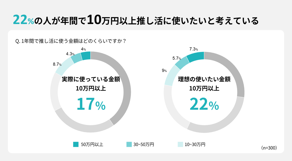 金融サービスを運営するGeNiEが実施した「推し活に関する実態調査」によれば、推し活層の年間平均支出額は約8万円だった。支出の内訳はグッズ購入が最も多く、ライブやイベントのチケット代、動画配信・サブスクリプション利用料、投げ銭など、その項目は多岐にわたる。ここで注目すべきは、理想と現実のギャップだ。実際に年間10万円以上を投じている層が全体の約17%にとどまるのに対し、理想の支出額として10万円以上を希望する層が22%もいることだ。