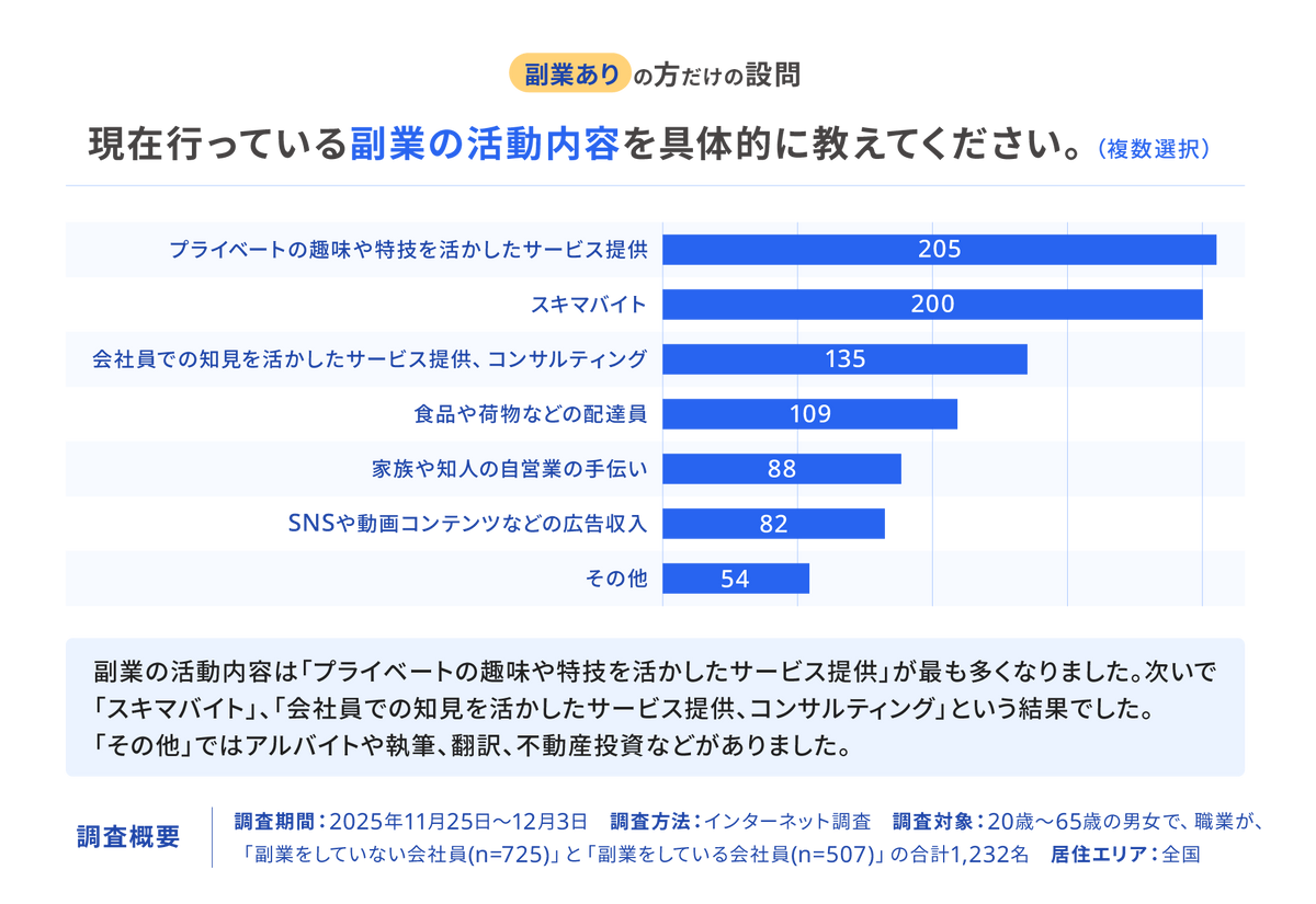 興味深いのは、実際に副業を行っている人たちの業務内容だ。最も多かったのは「プライベートの趣味や特技を活かしたサービス提供」で、次いで「スキマバイト」「会社員での知見を活かしたサービス提供、コンサルティング」という順になった。