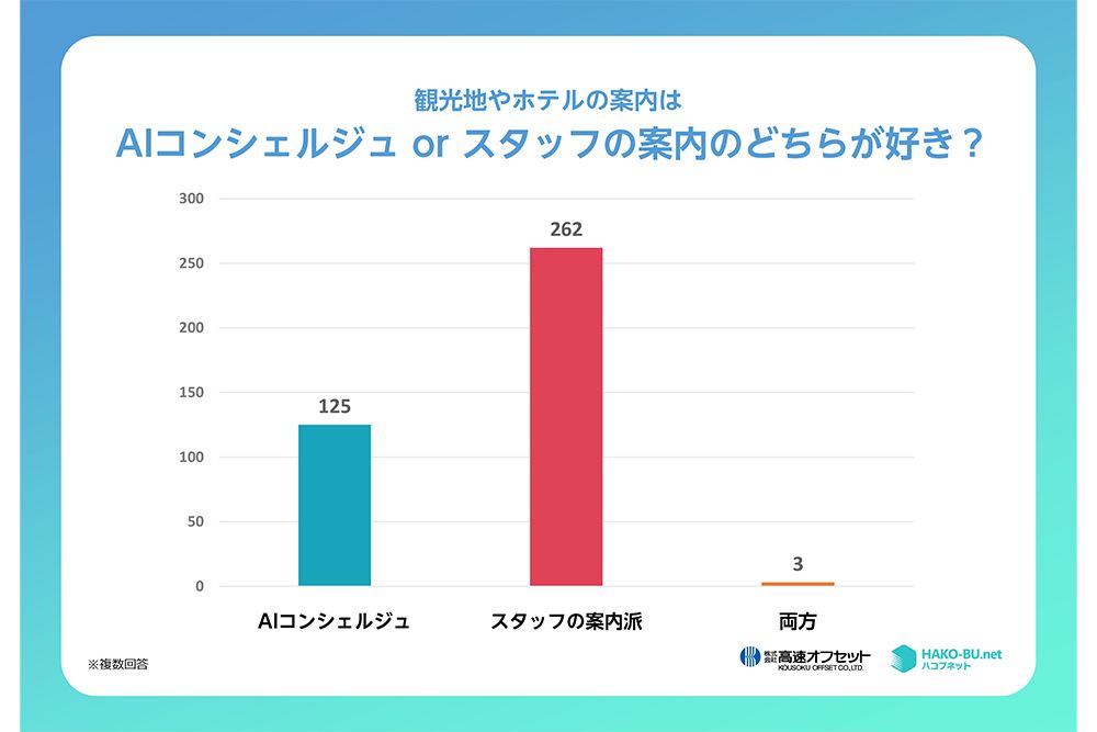 まずは旅先のインフォメーションセンターやホテルで観光案内を求めるとき、AIと人間のどちらがいいかを尋ねると、人間が圧勝した。人間を推す人からは、「地元のことは地元の人に聞きたい」、「聞くことも旅の思い出のひとつ」と答えている。機会があれば現地の人と触れ合いたいという気持ちがAIの利便性に勝ったようだ。