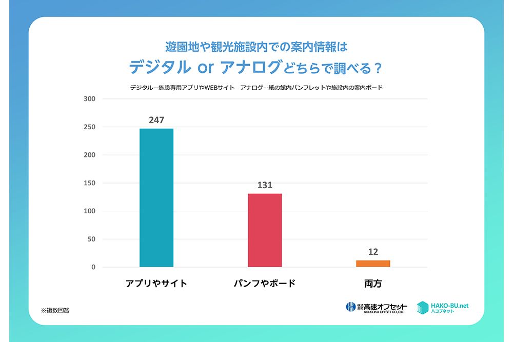 デザインや印刷業務を展開する高速オフセットは、昨年9月に愛知県で開催された「ツーリズムEXPOジャパン2025」の会場にて10〜70代の来場者390人を対象に、旅行に関連したサービスでデジタルとアナログのどちらを使うかを問うアンケート調査を実施した。観光サービスや接客ツールの改善や開発に役立てるためのものだが、どちらを使うかはシーンによって大きく分かれる結果となった。