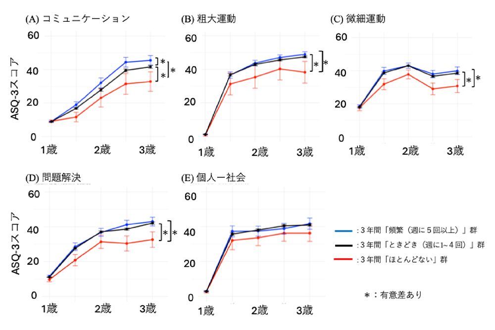 また、粗大運動、微細運動、問題解決では、「ほとんどない」と週5回以上との間に有意な差が見られた。個人-社会においては有意な差はなかったものの、読み聞かせを行うグループと「ほとんどない」との間にある程度の差があった。