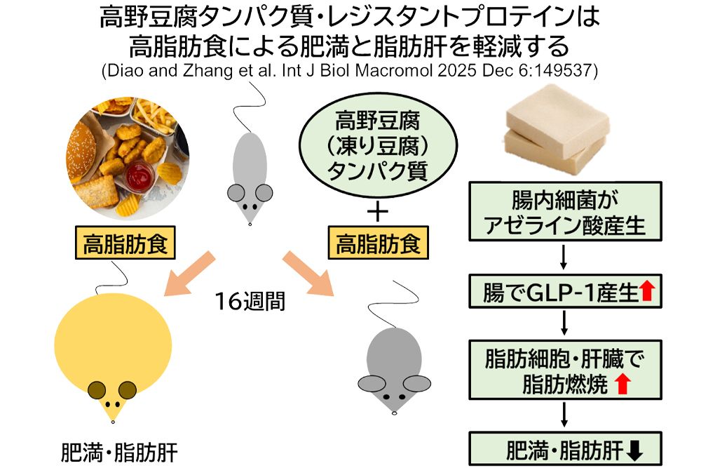 以上のことから、脂肪分の多い食事に高野豆腐を合わせることで、肥満や脂肪肝が軽減される可能性があると研究グループは結論付けている。今後もさらに、高野豆腐の健康寿命延伸への可能性を探っていくということだ。