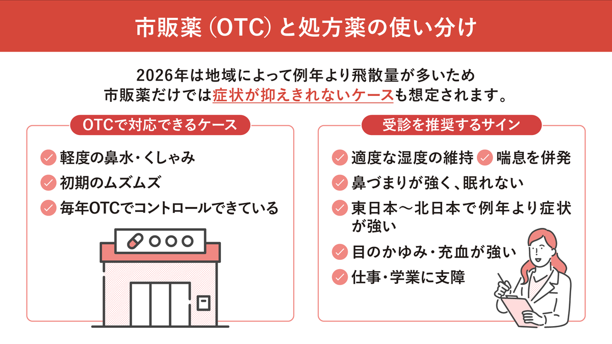 とくに飛散量が多い年は、初期対応の差がその後の生活の快適さを大きく左右する。鼻水やくしゃみだけでなく、鼻づまりによる睡眠不足、集中力の低下などが重なると、仕事や家事がままならなくなるケースもある。重症化を防ぐ意味でも、「まだ大丈夫」と思っている段階で動くことが重要だ。