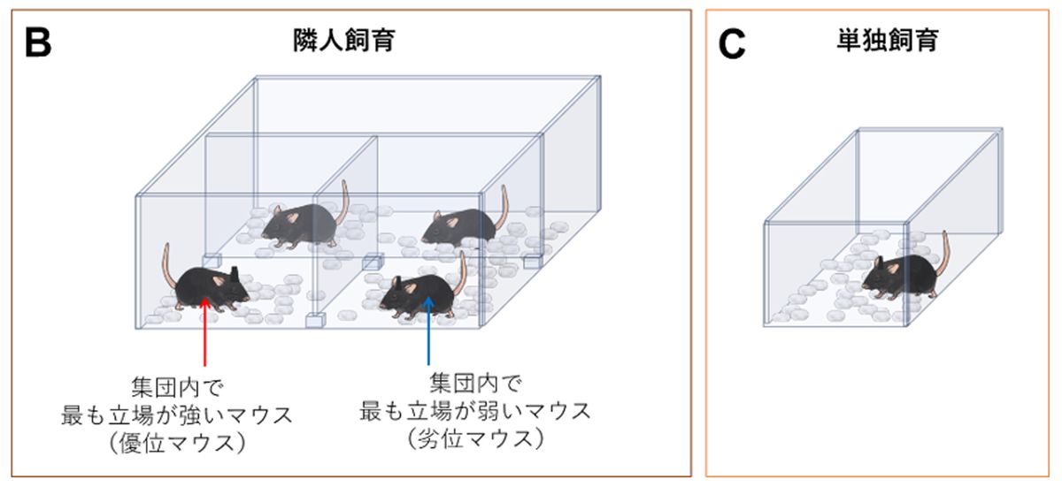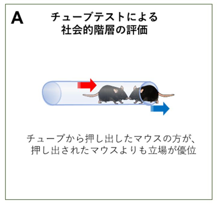 ペアになるマウスは、社会的な優位性が高いものと低いものを組み合わせた。社会的優位性は、チューブテストという方法で判断する。行き交うことができない細いパイプの両端からマウスを1匹ずつ入れて、中でかちあったとき、どちらが後退して道を譲るかを見る。道を譲ったほうが劣位、真っ直ぐ通れたほうが優位のマウスだ。それを繰り返して、いちばん優位のマウスといちばん劣位のマウスを選んだ。