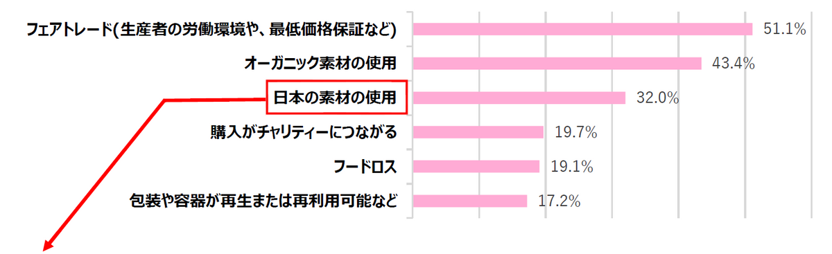 サステナブルな取り組みへの関心も高い。「フェアトレード」に関心があると答えた人は51.1%で過半数を超え、「オーガニック素材の使用」(43.4%)、「日本の素材の使用」(32.0%)も上位に入った。