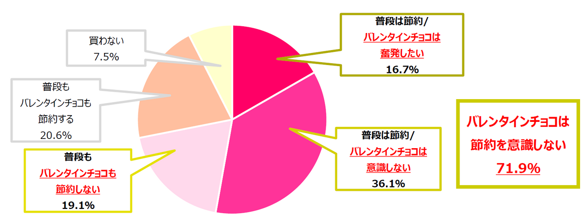 物価高騰が続く中、昨年のバレンタインチョコで値上げを感じた人は64.5%に上る。にもかかわらず、71.9%は節約を意識しないと回答した。値上げを実感しながらも、好きなもの・食べたいものへの投資は譲らないという「メリハリ消費」の姿勢が鮮明だ。
