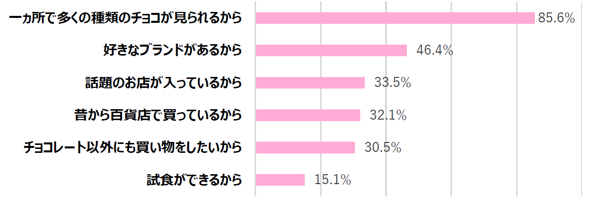 バレンタインチョコを百貨店で購入すると答えた人は87.4%に上る。その理由として「一カ所で多くの種類のチョコが見られるから」が85.6%で最多となり、「好きなブランドがあるから」(46.4%)、「話題のお店が入っているから」(33.5%)と続いた。