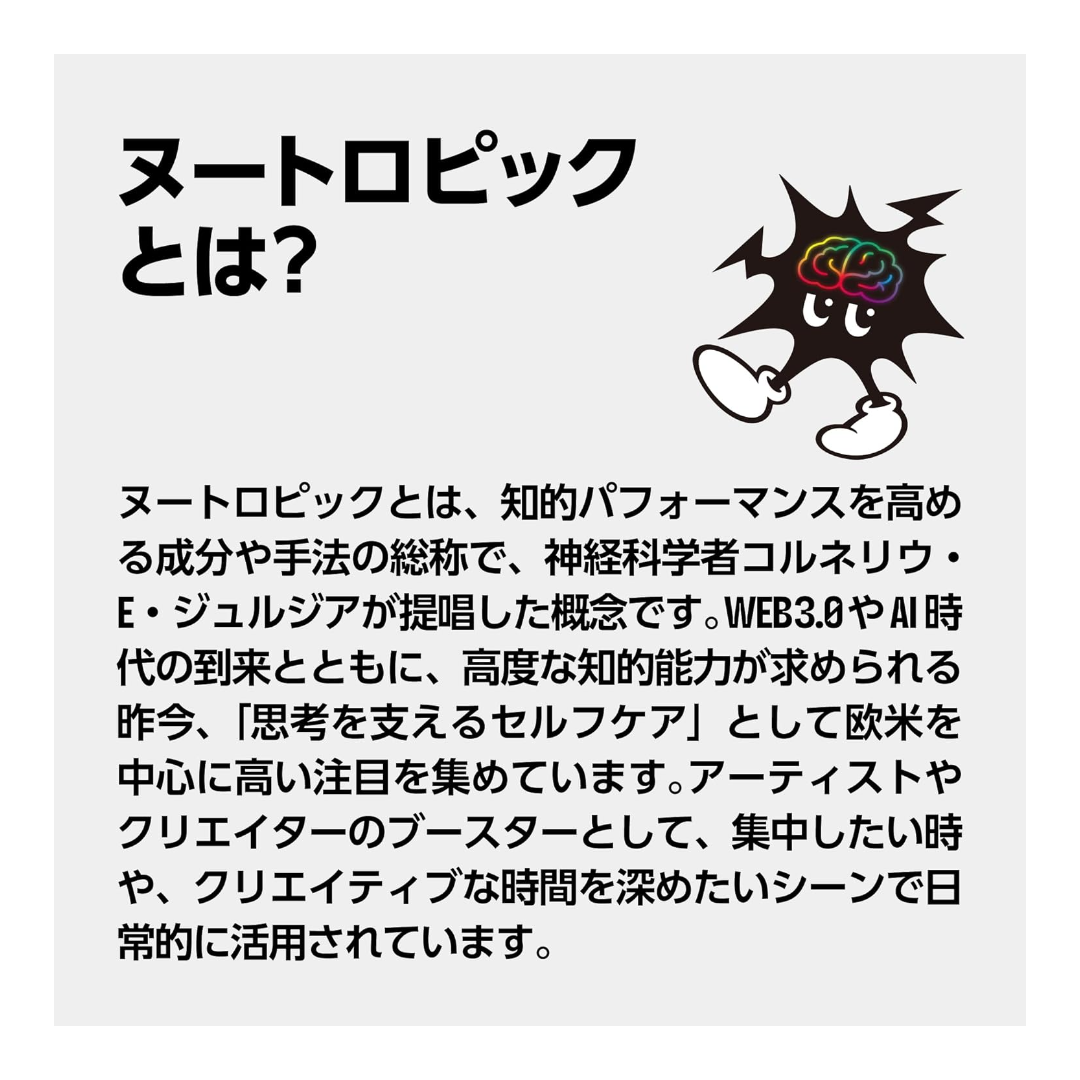 この製品の開発背景には、脳のコンディショニングに着目した「ヌートロピック(Nootropic)」という考え方があるという。限られた時間の中で成果を出したい、あるいは、集中すべき瞬間にしっかりとスイッチを入れたいという人は要注目だ。
