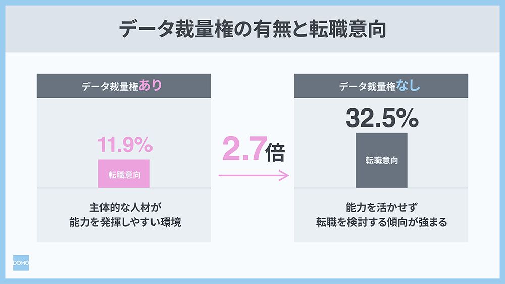 逆に、データ裁量権のない社員で増えるものもある。転職の意向だ。裁量権のある社員の転職意向は約12パーセントなのに対して、裁量権がない社員は約33パーセントにものぼる。裁量権がないと能力が十分に活かせず、転職を考えるというわけだ。