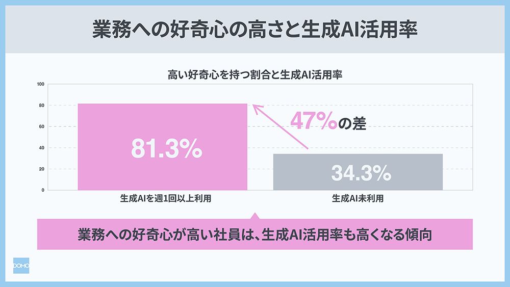 データ裁量権を持ち業務への好奇心が強い社員はまた、生成AIの活用率も高い。生成AIを週1回以上使う人の割合は、裁量権ありでは約80パーセント、なしでは約34パーセントと決定的な開きがある。