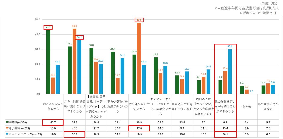 各読書形態の利用理由を尋ねたところ、紙書籍は「話により没入できるから」が42.7%でトップ。電子書籍は「持ち運びがしやすいから」が47.8%、オーディオブックは「スキマ時間で気軽に読める」が36.1%で最多となった。