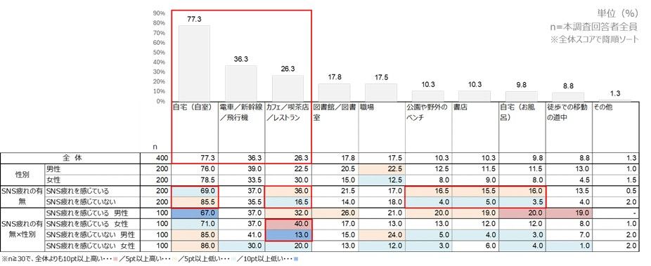 読書場所にも特徴が表れている。SNS疲れを感じている層では、カフェや喫茶店で読書をする人が36.0%に上り、特に女性では40.0%に達した。読書をする際に一緒にする行動では「あたたかい飲み物を飲みながら」が42.0%、「好きな音楽やBGMを聴きながら」が29.0%と、いずれもSNS疲れを感じていない層より高い。