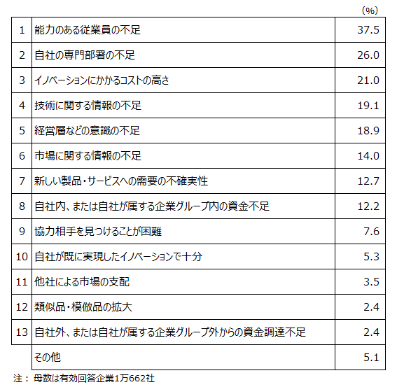 しかし、その歩みを止める壁も存在する。イノベーション活動を阻害する要因として、約4割の企業が「能力のある従業員の不足」を挙げた。資金やアイデア以上に、変革を主導し実行できる「人材」の確保こそが、最大のボトルネックとなっている。また、企業規模による格差も大きく、大企業の実施割合が47.8%と半数近いのに対し、小規模企業では26.3%と大きな開きが見られる。リソースの限られた中小・小規模企業にとって、いかにして変革の第一歩を踏み出すかが喫緊の課題だ。