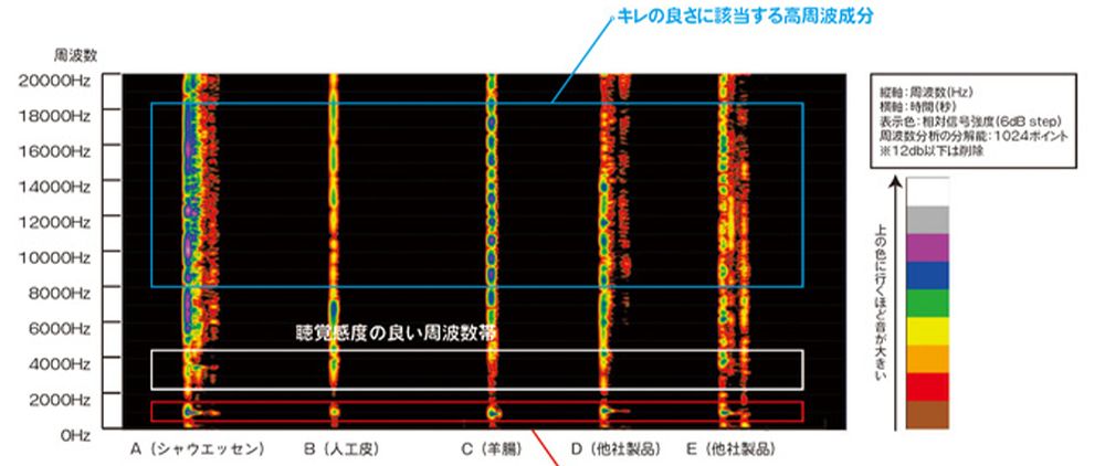 1種類につき80データを取得、解析して結果をグラフ表示したところ、シャウエッセンは、「瞬間的に破断するときの音」に該当する高周波数帯、「線の太さ」(音の頻度)、「色の分布」(音の強さ)ともに、「もっとも存在感のある」結果が示された。また、口の中で共鳴する成分(1000ヘルツ付近)の音も、シャウエッセンがもっとも強かった。