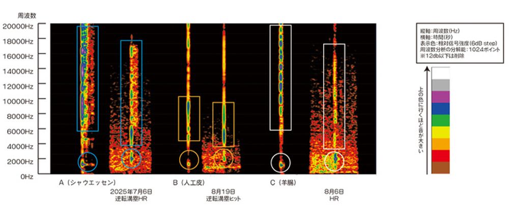 さらに、そのシャウエッセンの「パリッ」という音を、2025年7月6日の楽天戦でレイエスが放った逆転満塁ホームランなどの、高い周波数まで伸びて、持続時間も長いボールをバットの芯で捉えた力強い音の分布図が、シャウエッセンの音とほぼ同じだった。これらの音を差し替えても「違和感がないほど酷似」していたそうだ。