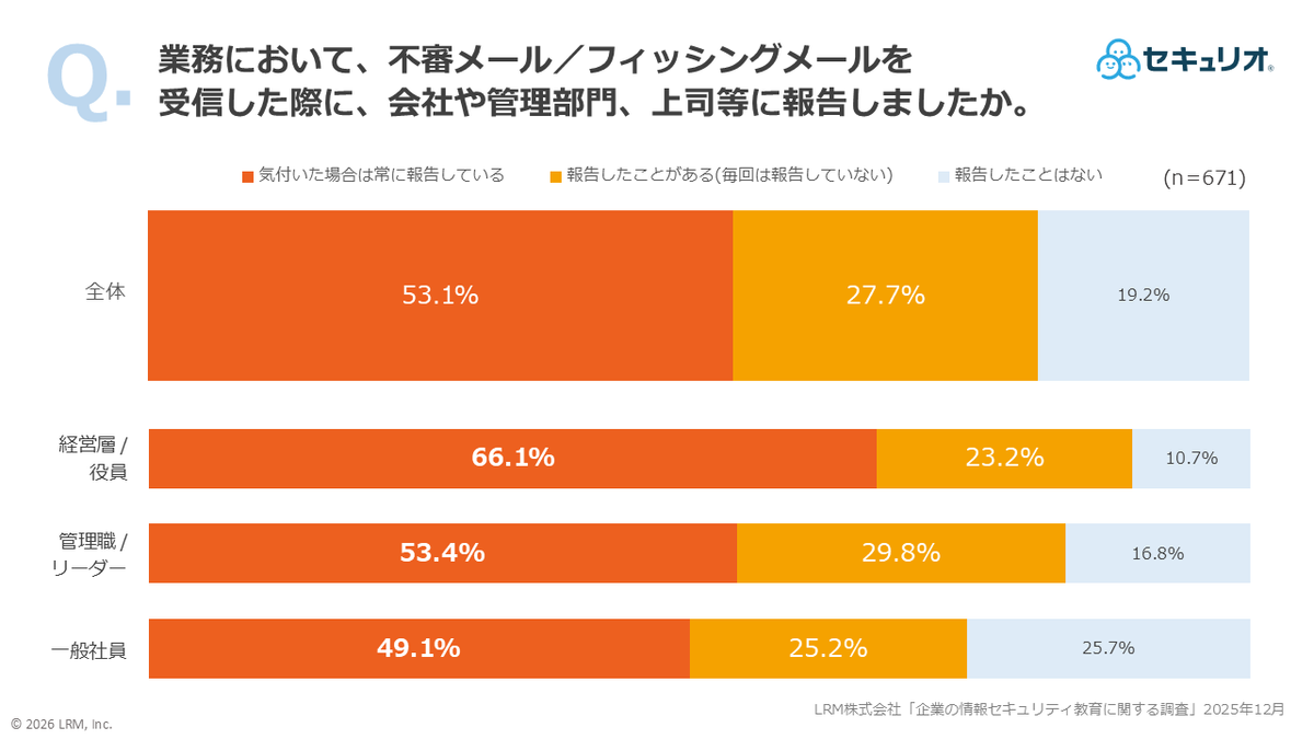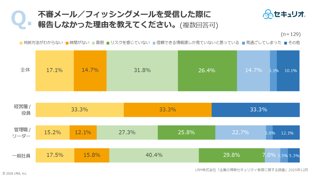特に、組織として重大なリスクを早期に察知するための「報告」において、不審メールを受信した際に報告しない最大の理由は「面倒だから(31.8%)」という心理的なハードルにある。多忙を極める経営層においては「時間不足」や、攻撃の巧妙化に伴う「判断基準の欠如」が障壁となっている実態も明らかになった。どれほど知識があっても、報告プロセスが業務の負担となるようでは、組織の防御力は高まらない。