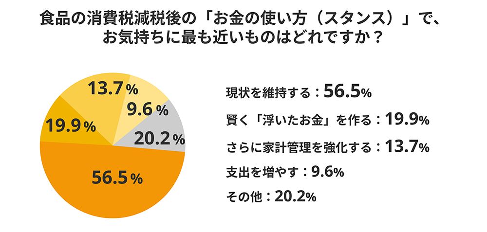 食料品の消費税減税が実現したら、けっこう助かりそうだが、そうなった場合にお金の使い方が変わるかを尋ねると、約57パーセントの人が「現状維持」と答えた。さらに家計管理を強化するという人も約14パーセントと多く、支出を増やすという人は10パーセントに満たない。