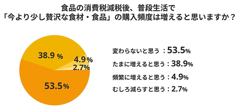 また消費税減税で、少し贅沢な食材や食品を買う頻度が増えるかと聞くと、「変わらない」が約54パーセントともっとも多く、「たまに増えると思う」が約39パーセントとなった。